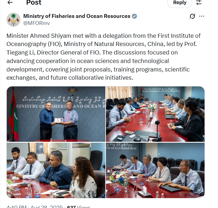 On August 31, Chinese President XI Jinping met with Maldives President Mohamed Muizzu in Tianjin. President Xi emphasized China is ready to deepen practical collaboration with Maldives and strengthen cooperation in marine scientific survey, environment protection and disaster prevention and mitigation. This visit to Maldives represents a concrete effort by FIO to implement the outcomes of the head-of-state diplomacy between the two countries. Moving forward, FIO will continue to advance cooperation with the Maldives in marine science, technology, and capacity building, contributing to the joint construction of a China-Maldives maritime community with a shared future.
